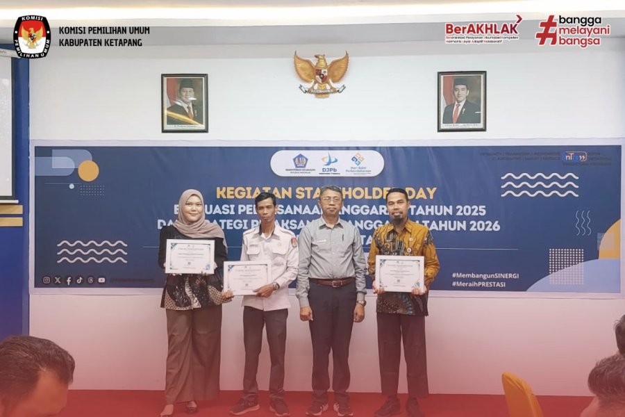 Ketapang, kpu-ketapangkab.go.id – Komisi Pemilihan Umum (KPU) Kabupaten Ketapang menerima Piagam Penghargaan terbaik ke-2 sebagai satuan kerja terbaik atas Pengiriman Laporan Pertanggungjawaban (LPJ) Bendahara Tepat Waktu di lingkup KPPN Tipe A2 Ketapang periode Tahun 2025. Penghargaan tersebut tertuang dalam Piagam Penghargaan Nomor: KEP-27/KPN.1704/2026, diberikan kepada KPU Kabupaten Ketapang (Kode Satker 658499), dan ditetapkan di Ketapang pada 20 Januari 2026 serta ditandatangani secara elektronik oleh Kepala KPPN Ketapang, Bulus Lumban Gaol, S.E., M.M. Penghargaan ini diterima dalam rangkaian kegiatan Stakeholder Day, Evaluasi Pelaksanaan Anggaran Tahun 2025 dan Strategi Pelaksanaan Anggaran Tahun 2026 Satker Lingkup KPPN Ketapang, yang dilaksanakan pada Kamis (22/1/2026) di Aula KPPN Ketapang. Kegiatan tersebut turut dihadiri oleh para Kuasa Pengguna Anggaran (KPA) lingkup satuan kerja mitra KPPN Ketapang, Kepala Badan Pengelolaan Keuangan dan Aset Daerah Kabupaten Ketapang, serta Kepala Badan Keuangan Daerah Kabupaten Kayong Utara. KPU Kabupaten Ketapang dalam kegiatan tersebut dihadiri oleh Junaidi, staf Subbagian Keuangan, Umum, dan Logistik Sekretariat KPU Kabupaten Ketapang yang mewakili Plt Sekretaris. Kegiatan ini juga sekaligus menjadi forum koordinasi dalam rangka meningkatkan kualitas pelaksanaan anggaran Tahun 2026, serta dilaksanakan penandatanganan Pakta Integritas Eksternal Tahun Anggaran 2026. Melalui capaian tersebut, KPU Kabupaten Ketapang menegaskan komitmennya untuk terus menjaga kinerja pengelolaan keuangan yang tertib, akuntabel, dan tepat waktu, sekaligus mendukung peningkatan kualitas pelaksanaan anggaran serta pelayanan publik yang lebih baik ke depan. KPPN Ketapang dalam kesempatan itu juga menegaskan komitmennya sebagai instansi berpredikat Wilayah Bebas dari Korupsi (WBK), Wilayah Birokrasi Bersih dan Melayani (WBBM), serta Pelayanan Publik PRIMA (Predikat A). Seluruh layanan diselenggarakan dengan standar pelayanan yang jelas, tanpa biaya (Rp0) atau gratis, serta menjunjung tinggi prinsip anti korupsi dan anti gratifikasi dengan ajakan tolak dan lapor gratifikasi. ....