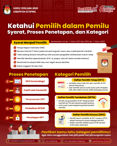 Ketapang, kab-ketapang.kpu.go.id – Dalam penyelenggaraan Pemilu, pemilih merupakan unsur utama yang menentukan kualitas demokrasi. Oleh karena itu, setiap warga negara perlu memahami apakah dirinya sudah terdaftar, termasuk dalam kategori apa, serta bagaimana proses penetapan data pemilih dilakukan. Berdasarkan Undang-Undang Nomor 7 Tahun 2017 tentang Pemilihan Umum dan Peraturan KPU (PKPU) Nomor 7 Tahun 2022 tentang Penyusunan Daftar Pemilih, proses pendataan pemilih dilakukan secara sistematis, berjenjang, dan berkelanjutan guna memastikan hak pilih masyarakat terpenuhi secara optimal. Syarat Menjadi Pemilih Agar dapat menggunakan hak pilih dalam Pemilu, seseorang harus memenuhi sejumlah persyaratan sebagai berikut: Warga Negara Indonesia (WNI) Berusia minimal 17 tahun pada hari pemungutan suara, atau sudah/pernah menikah Tidak sedang dicabut hak pilihnya berdasarkan putusan pengadilan yang berkekuatan hukum tetap Memiliki identitas kependudukan seperti KTP-el, KK, atau dokumen resmi lainnya Berdomisili di wilayah NKRI atau luar negeri sesuai identitas Bukan anggota TNI atau Polri Ketentuan ini bertujuan memastikan bahwa pemilih yang terdaftar benar-benar memenuhi syarat secara hukum dan administratif. Proses Penetapan Data Pemilih Proses penyusunan daftar pemilih dilakukan melalui beberapa tahapan penting, yaitu: 1. Penyusunan Data Awal (DP4) Data Penduduk Potensial Pemilih Pemilu (DP4) diperoleh dari Kementerian Dalam Negeri sebagai basis awal penyusunan daftar pemilih. 2. Coklit oleh Pantarlih Petugas Pemutakhiran Data Pemilih (Pantarlih) melakukan pencocokan dan penelitian (coklit) secara langsung ke rumah warga untuk memastikan data valid. 3. Penyusunan DPS Hasil coklit kemudian disusun menjadi Daftar Pemilih Sementara (DPS) yang diumumkan kepada publik untuk mendapatkan tanggapan masyarakat. 4. Perbaikan DPSHP Masyarakat dapat memberikan masukan atau koreksi, yang kemudian diolah menjadi Daftar Pemilih Sementara Hasil Perbaikan (DPSHP). 5. Penetapan DPT Tahap akhir adalah penetapan Daftar Pemilih Tetap (DPT) sebagai daftar resmi pemilih dalam Pemilu. Proses ini mencerminkan prinsip akuntabilitas dan transparansi, serta memberikan ruang partisipasi publik dalam memastikan keakuratan data pemilih. Kategori Pemilih dalam Pemilu Dalam pelaksanaannya, pemilih dibagi ke dalam beberapa kategori sebagai berikut: 1. Daftar Pemilih Tetap (DPT) Pemilih yang telah terdaftar secara resmi oleh KPU dan akan memberikan suara di TPS sesuai alamat domisili. Ciri utama: Terdaftar dalam DPT Mendapat undangan memilih (C6) Memilih di TPS sesuai alamat 2. Daftar Pemilih Tambahan (DPTb) Pemilih yang sudah terdaftar di DPT, tetapi karena kondisi tertentu harus memilih di TPS lain. Contoh kondisi: Pindah domisili sementara Tugas kerja Kondisi khusus lainnya 3. Daftar Pemilih Khusus (DPK) Pemilih yang belum terdaftar dalam DPT maupun DPTb, tetapi tetap memenuhi syarat sebagai pemilih. Ketentuan: Menggunakan KTP-el Dilayani di TPS sesuai domisili Biasanya memilih pada jam terakhir (setelah pukul 12.00) Pentingnya Mengetahui Status Pemilih Mengetahui status pemilih sangat penting agar masyarakat tidak kehilangan hak pilihnya. Kesalahan data, keterlambatan pengecekan, atau kurangnya informasi sering menjadi penyebab tidak terdaftarnya pemilih dalam DPT. Melalui layanan seperti Pemutakhiran Data Pemilih Berkelanjutan (PDPB), masyarakat dapat secara aktif melaporkan perubahan data, memastikan dirinya tetap terdaftar, dan berpartisipasi dalam Pemilu. Pemahaman mengenai syarat, proses penetapan, dan kategori pemilih merupakan bagian penting dari pendidikan demokrasi. Dengan mengetahui posisi dan status sebagai pemilih, masyarakat dapat menggunakan hak pilihnya secara tepat dan bertanggung jawab. KPU Kabupaten Ketapang terus mendorong partisipasi aktif masyarakat melalui sosialisasi dan layanan data pemilih, sebagai bentuk komitmen dalam mewujudkan Pemilu yang jujur, adil, transparan, dan akuntabel. Pastikan kamu tahu kategori pemilihmu, agar tidak kehilangan hak pilih pada hari pemungutan suara! ....