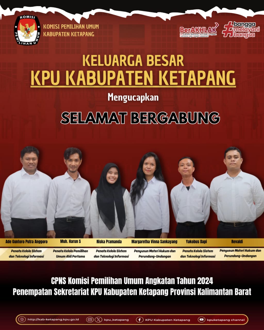 CPNS yang baru bergabung diantaranya Muh. Harun S, Yakobus Dapi, Riska Pramanda, Margaretha Vinna Sankayang, Revaldi, dan Ade Guntoro Putra Anggoro. Dengan bergabungnya CPNS formasi 2024 ini, KPU Ketapang optimis akan semakin memperkuat kinerja kelembagaan, terutama dalam menghadapi berbagai agenda nasional dan pemilu yang akan datang.
