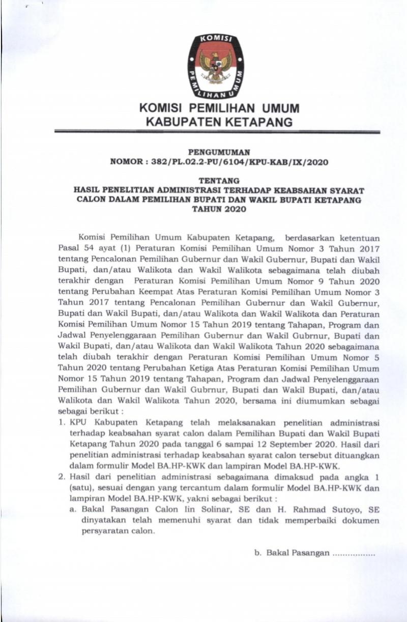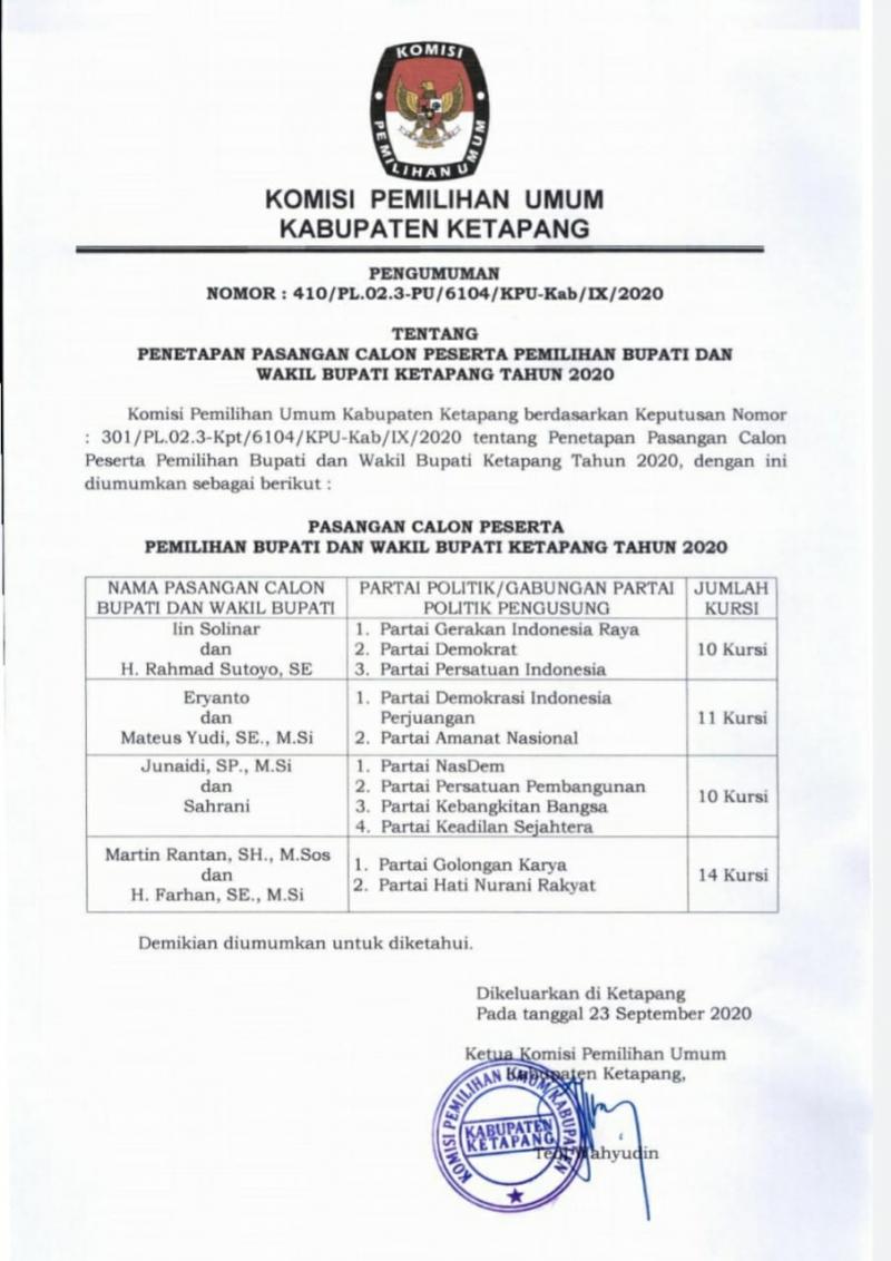 Melalui rapat pleno tersebut, KPU Kabupaten Ketapang berhasil melakukan rekapitulasi dan menetapkan daftar pemilih sementara dengan jumlah 350.587 (Tiga Ratus Lima Puluh Ribu Lima Ratus Delapan Puluh Tujuh) pemilih dengan rincian laki-laki berjumlah 181.391 (Seratus Delapan Puluh Satu Ribu Tiga Ratus Sembilan Puluh Satu) pemilih dan perempuan berjumlah 169.196 (Seratus Enam Puluh Sembilan Ribu Seratus Sembilan Puluh Enam) pemilih yang tersebar di 20 (Dua Puluh) kecamatan, 262 (Dua Ratus Enam Puluh Dua) Desa/Kelurahan, 1.142 (Seribu Seratus Empat Puluh Dua) TPS.