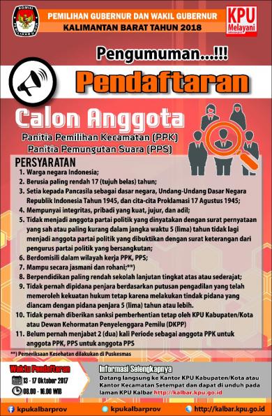 KETAPANG - Proses pengangkatan atau perekrutan penyelenggara pemilihan umum Gubernur dan Wakil Gubernur Kalimantan Barat tahun 2018 akan dimulai 12-14 Oktober ini. Sekarang sedang pada tahapan pengumuman pendaftaran. “Pendaftaran mulai 13-17 Oktober 2017, tahapan ini telah ditetapkan oleh KPU Kalimantan Barat meliputi pengumuman pendaftaran, verifikasi administrasi terhadap dokumen pendaftaran, seleksi tertulis dan wawancara hingga penetapannya menjadi Panitia Pemilihan Kecamatan dan Panitia Pemungutan Suara,†kata Ketua KPU Ketapang Ronny Irawan, di ruang kerjanya Rabu (4/10). Ia menyebutkan selama satu bulan, kedua lembaga penyelenggara ini sudah terbentuk demikian juga dengan sekretariatnya. Sebutnya, komposisinya sama seperti Pemilu atau Pilkada sebelumnya yakni untuk PPK sebanyak 5 orang sedangkan PPS sebanyak 3 orang. “PPK dan PPS merupakan perpanjangan tangan KPU Kabupaten di tingkat kecamatan dan desa/kelurahan. Peran dan tugas mereka sangat menentukan keberhasilan penyelenggaraan pemilihan umum nantinya,†ungkapnya. Ronny mengatakan karena itu dalam proses pengangkatannya melewati beberapa tahap seleksi mulai dari seleksi administrasi, tertulis hingga wawancara. Menurutnya, hal ini bertujuan untuk mendapatkan penyelenggara pemilihan yang berintegritas dan mampu bekerja penuh waktu. “Syaratnya sangat jelas diatur dalam Keputusan KPU Kalimantan Barat Nomor 17/HK.03.1-Kpt/61/Prov/VIII/2017 sebagaimana diubah dengan Keputusan KPU Kalimantan Barat Keputusan nomor 28 /HK.03.1-Kpt/61/Prov/VIII/2017 tentang Pedoman Teknis Tata Kerja KPU Provinsi, KPU Kabupaten/Kota, PPK, PPS dan KPPS. Syarat-syarat tersebut, yakni WNI, berusia paling rendah 17 tahun, setia kepada Pancasila sebagai dasar negara dan Undang-Undang Dasar 1945, NKRI, Bhinneka Tunggal Ika, dan cita-cita Proklamasi 17 Agustus 1945,†paparnya. Adapun syarat lain, Ronny mengatakan yakni mempunyai integritas, pribadi yang kuat, jujur dan adil,tidak menjadi anggota partai politik yang dinyatakan dengan surat pernyataan yang sah atau sekurang-kurangnya dalam jangka waktu 5 tahun tidak lagi menjadi anggota partai politik yang dibuktikan dengan surat keterangan dari pengurus parpol yang bersangkutan dan berdomisili dalam wilayah kerja PPK/PPS. Syarat lain, kata dia, mampu secara jasmani dan rohani, berpendidikan paling rendah SLTA atau sederajat dan tidak pernah dipidana penjara berdasarkan putusan pengadilan yang telah memperoleh kekuatan hukum tetap karena melakukan tindak pidana yang diancam dengan pidana penjara 5 tahun atau lebih. “Syarat lainnya tidak pernah diberikan sanksi pemberhentian tetap oleh KPU Kabupaten atau DKPP dan belum pernah menjabat 2 periode sebagai anggota PPK/PPS. Masa dua periode ini yakni periode 1 (Pemilu legislatif, Pemilu Presiden ataupun Pilkada) tahun 2005-2009 dan periode 2 (Pemilu legislatif, Pemilu Presiden ataupun Pilkada) tahun 2010-2014.Calon yang ingin mendaftar wajib mengisi formulir pendaftaran yang disediakan KPU Kabupaten Ketapang yang dapat diperoleh di Sekretariat KPU Kabupaten atau kantor Camat setempat atau dapat diunduh melalui website kpu-ketapangkab.go.id.,†ungkapnya. Ronny mengemukakan teknis seleksi untuk PPK akan dilakukan secara tertulis dan wawancara untuk memperoleh rekam jejak para calon yang akan dilaksanakan di kecamatan masing-masing. Dikatakannya, sedangkan PPS tidak dilakukan wawancara namun wajib mengikuti seleksi tertulis. “Persyaratan administratif semua calon yang mendaftar baik PPK maupun PPS mesti memenuhi syarat yang sama sesuai dengan ketentuan perundangan. Sebagai langkah awal KPU Kabupaten Ketapang akan berkoordinasi dengan Pemerintah Daerah dalam proses rekruitmen ini terutama para Camat untuk dapat membantu rekruitmen PPK/PPS ini,†pungkas Ronny. formulir pendaftaran dapat diunduh disini
