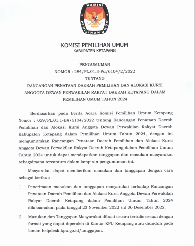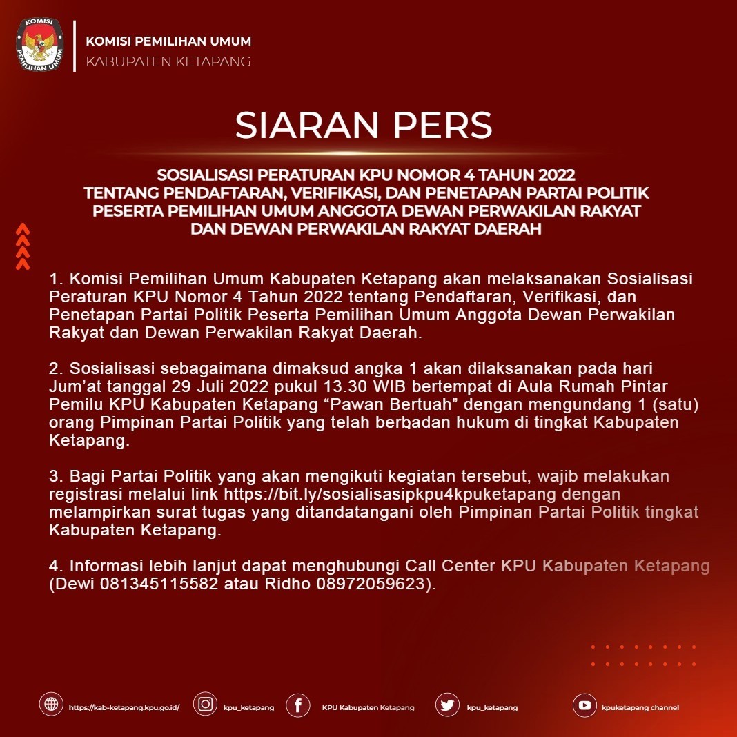 Komisi Pemilihan Umum Kabupaten Ketapang akan melaksanakan Sosialisasi Peraturan KPU Nomor 4 Tahun 2022 tentang Pendaftaran, Verifikasi, dan Penetapan Partai Politik Peserta Pemilihan Umum Anggota Dewan Perwakilan Rakyat dan Dewan Perwakilan Rakyat Daerah.