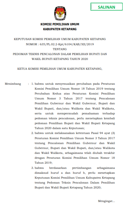 PEDOMAN TEKNIS PENCALONAN DALAM PEMILIHAN BUPATI DAN WAKIL BUPATI KETAPANG TAHUN 2020 Rabu, 11 Desember 2019 00:00 59 Pedoman Teknis Pencalonan dalam Pemilihan Bupati dan Wakil Bupati Ketapang Tahun 2020 dapat diakses melalui tautan berikut ini Baca Selengkapnya