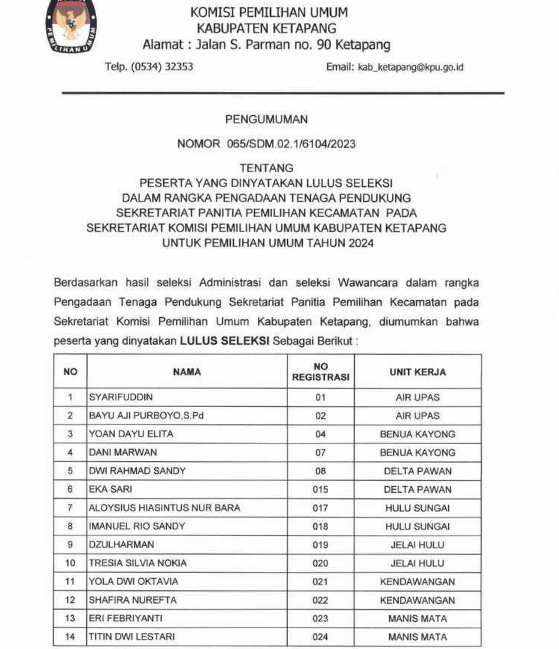 PENGUMUMAN TENAGA PENDUKUNG PADA SEKRETARIAT PPK Senin, 14 Maret 2022 17:04 86 Sekretaris KPU Ketapang telah menetapkan tenaga pendukung pada Sekretariat PPK di Kabupaten Ketapang. Pengumuman dapat diakses di sini. Baca Selengkapnya