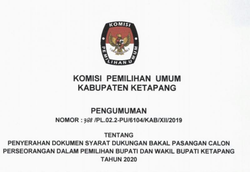 Pengumuman Syarat Dukungan Bakal PASLON Perseorangan Pemilihan Bupati dan Wakil Bupati Tahun 2020 Selasa, 03 Desember 2019 00:00 293 KETAPANG – Pengumuman Penyerahan Dokumen Syarat Dukungan Bakal PASLON Perseorangan Pemilihan Bupati dan Wakil Bupati Tahun 2020 Pengumuman dan Formulir B.1-KWK dapat diunduh disini Baca Selengkapnya