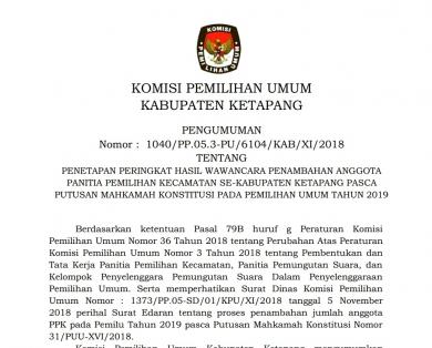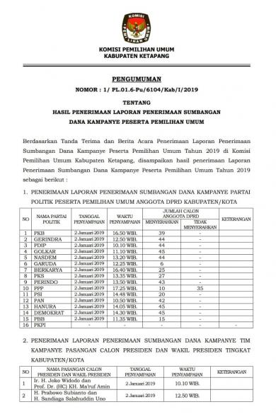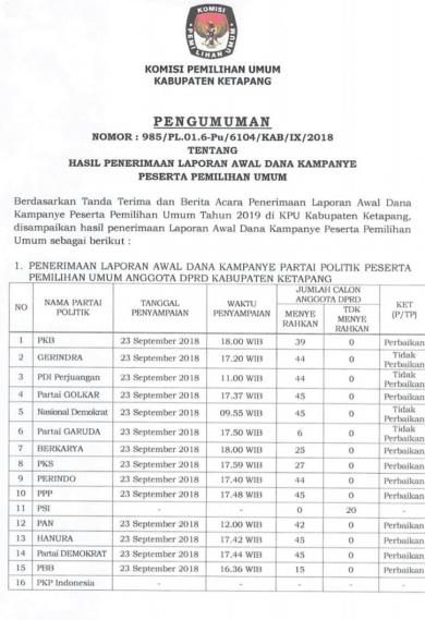 KETAPANG – Berdasarkan Surat Keputusan Komisi Pemilihan Umum Kabupaten Ketapang Nomor : 31/HK.03-1-Kpt/6104/KPU-Kab/IX/2018 Tentang Penetapan Daftar Calon Tetap (DCT) Anggota Dewan Perwakilan Rakyat Daerah Kabupaten Ketapang Pada Pemilihan Umum Tahun 2019, bersama ini diumumkan kepada masyarakat Kabupaten Ketapang, nama-nama calon Anggota Dewan Perwakilan Rakyat Daerah Kabupaten Ketapang pada Pemilihan Umum Tahun 2019.Dapil Ketapang 1 unduh disiniDapil Ketapang 2 unduh disiniDapil Ketapang 3 unduh disiniDapil Ketapang 4 unduh disiniDapil Ketapang 5 unduh disiniDapil Ketapang 6 unduh disini