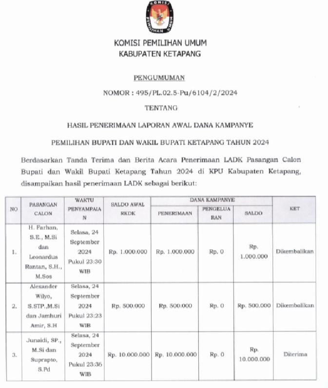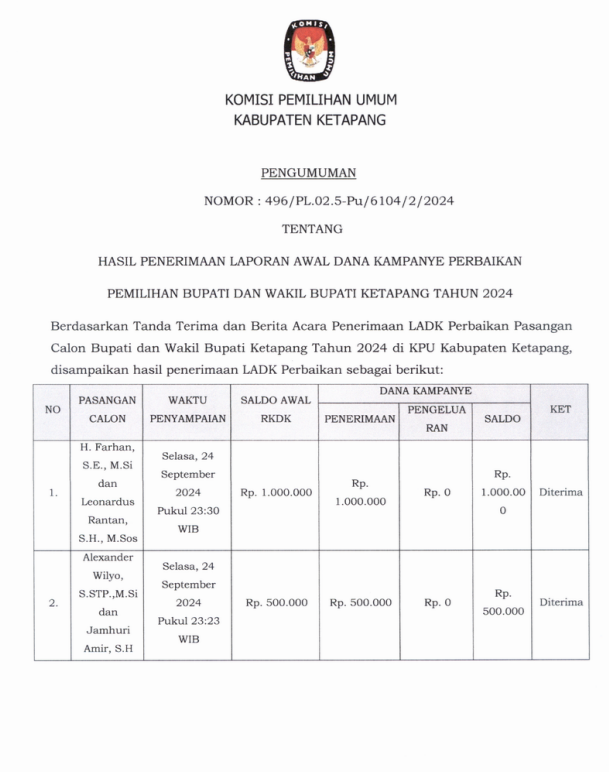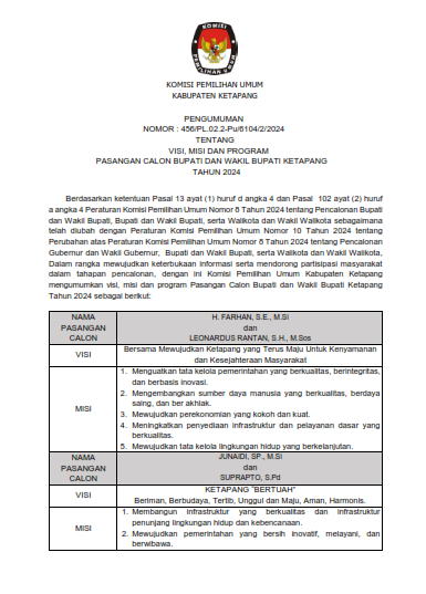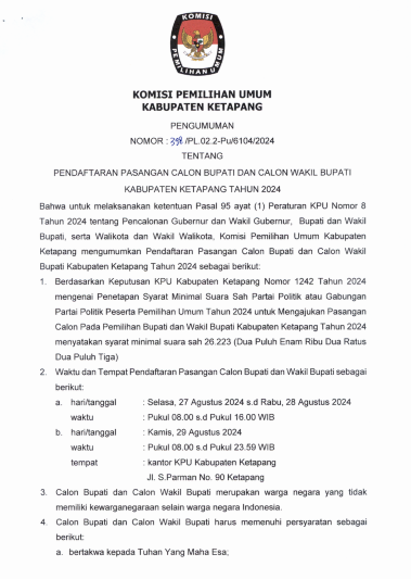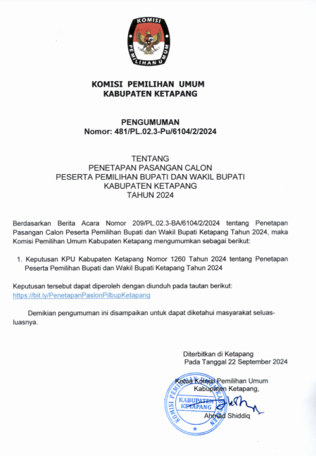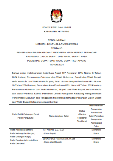KPU Ketapang telah menerbitkan pengumuman No 449/PL.02.2-Pu/6104/2024 tentang Penerimaan Masukan dan Tanggapan Masyarakat terhadap Pasangan Calon Bupati dan Wakil Bupati pada Pemilihan Bupati dan Wakil Bupati Ketapang Tahun 2024. Informasi lebih lanjut dapat diakses pada tautan ini