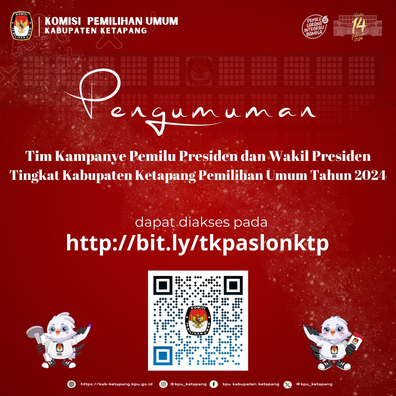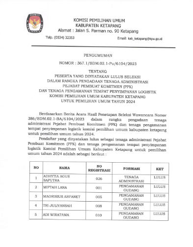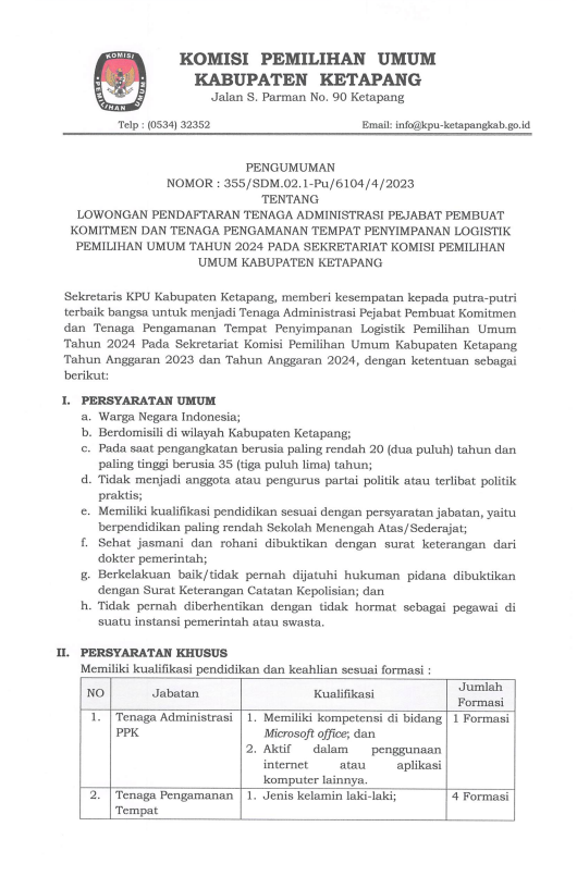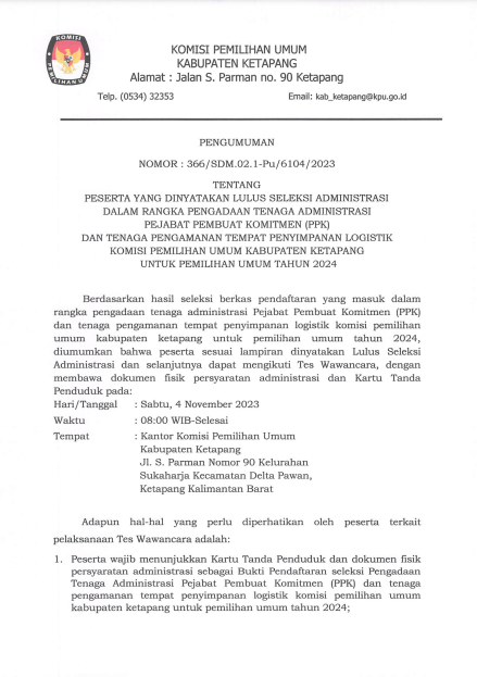 Hai #TemanPemilih, mari bergabung bersama KPU Kabupaten Ketapang sebagai tenaga administrasi pejabat pembuat komitmen dan tenaga pengamanan tempat penyimpanan logistik untuk Pemilu tahun 2024. Penerimaan pendaftaran dibuka mulai tanggal 28 Oktober sd 1 November 2023. Informasi selengkapnya dapat diakses pada tautan berikut.