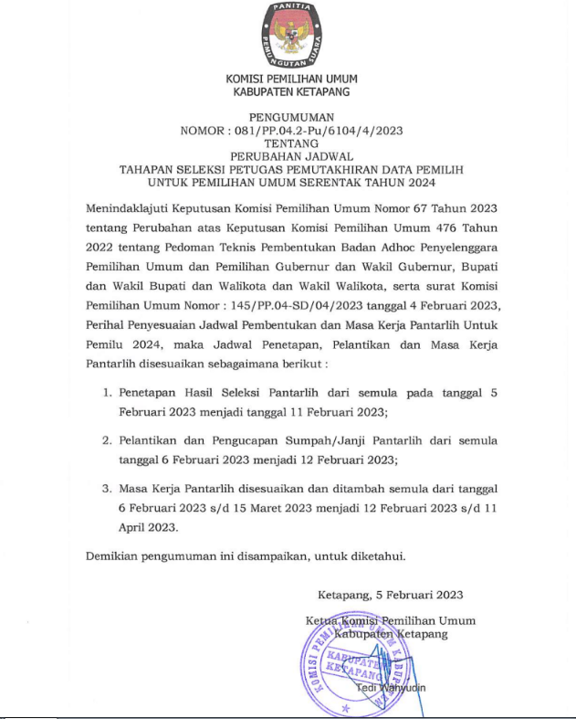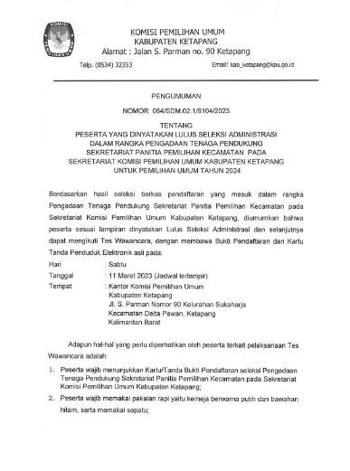 PENGUMUMAN PESERTA SEKRETARIAT PPK YANG DINYATAKAN LULUS SELEKSI ADMINISTRATIF Jumat, 10 Maret 2023 18:12 113 Pengumuman peserta sekretariat PPK KPU Kabupaten Ketapang yang dinyatakan lulus seleksi administratif dapat dilihat di sini. Baca Selengkapnya