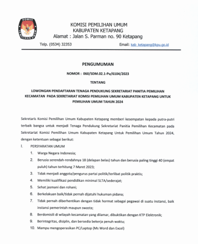 PENGUMUMAN PENDAFTARAN TENAGA PENDUKUNG SEKRETARIAT PPK Selasa, 07 Maret 2023 13:23 154 Sekretaris KPU Kabupaten Ketapang memberikan kesempatan untuk putra putri terbaik bangsa untuk berperan sebagai tenaga pendukung Sekretariat PPK untuk Pemilu Tahun 2024. Pengumuman detail dapat diakses di sini. Baca Selengkapnya
