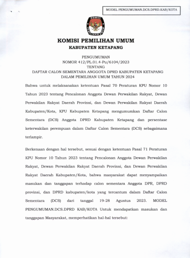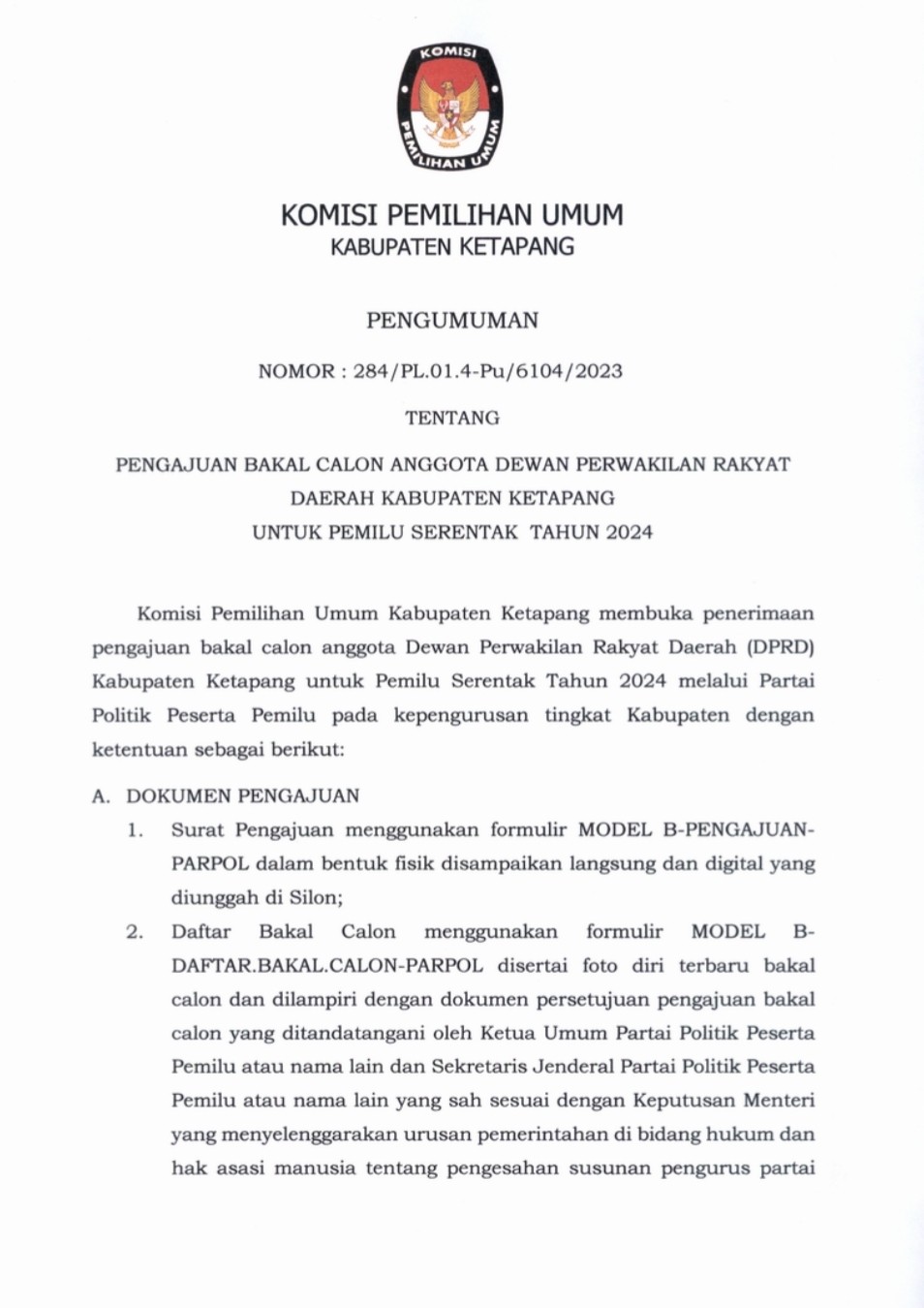 Pengumuman Pengajuan Bakal Calon Anggota DPRD Kab. Ketapang untuk Pemilu Tahun 2024 Senin, 24 April 2023 10:44 2109 Pengumuman Pengajuan Bakal Calon Anggota DPRD Kab. Ketapang untuk Pemilu Tahun 2024 dapat diakses pada tautan berikut. Baca Selengkapnya