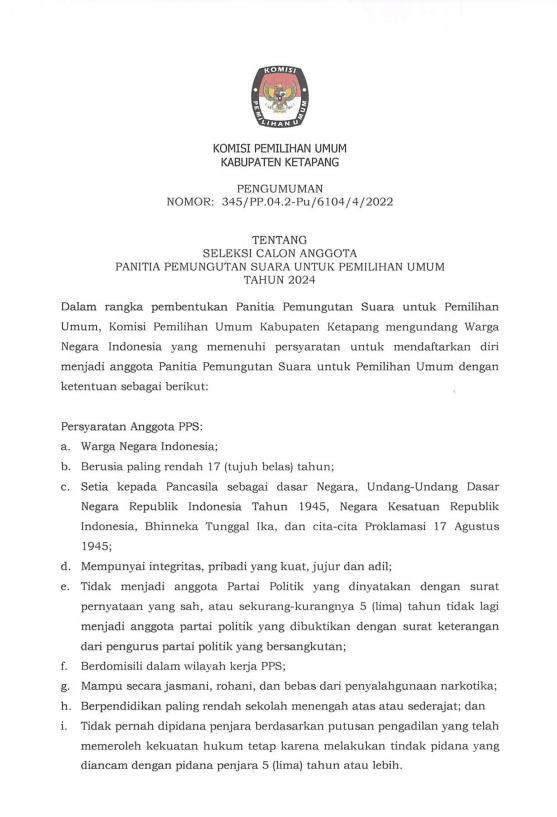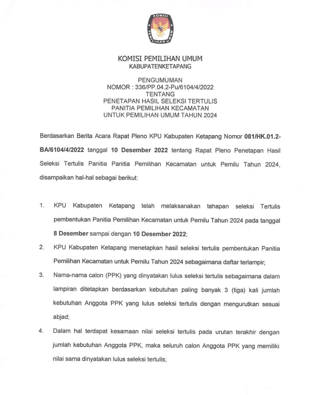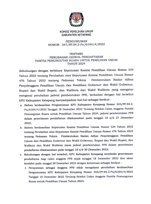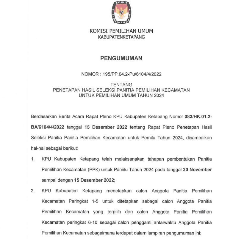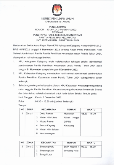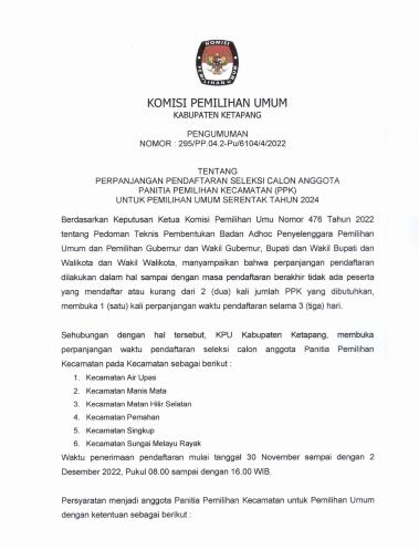 Komisi Pemilihan Umum melakukan perpanjangan masa pendaftaran seleksi calon anggota Panitia Pemilihan Kecamatan selama 3 (tiga) hari pada kecamatan berikut: